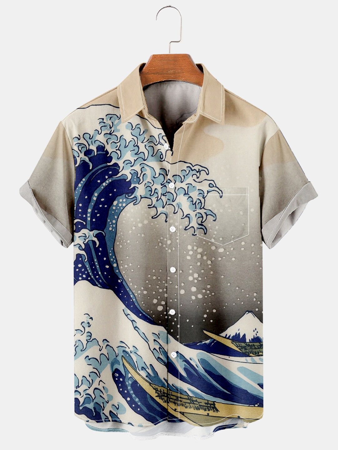 Mens Japanese Ukiyoe Wave Print Casual Breathable Chest Pocket Short Sleeve Hawaiian Shirts