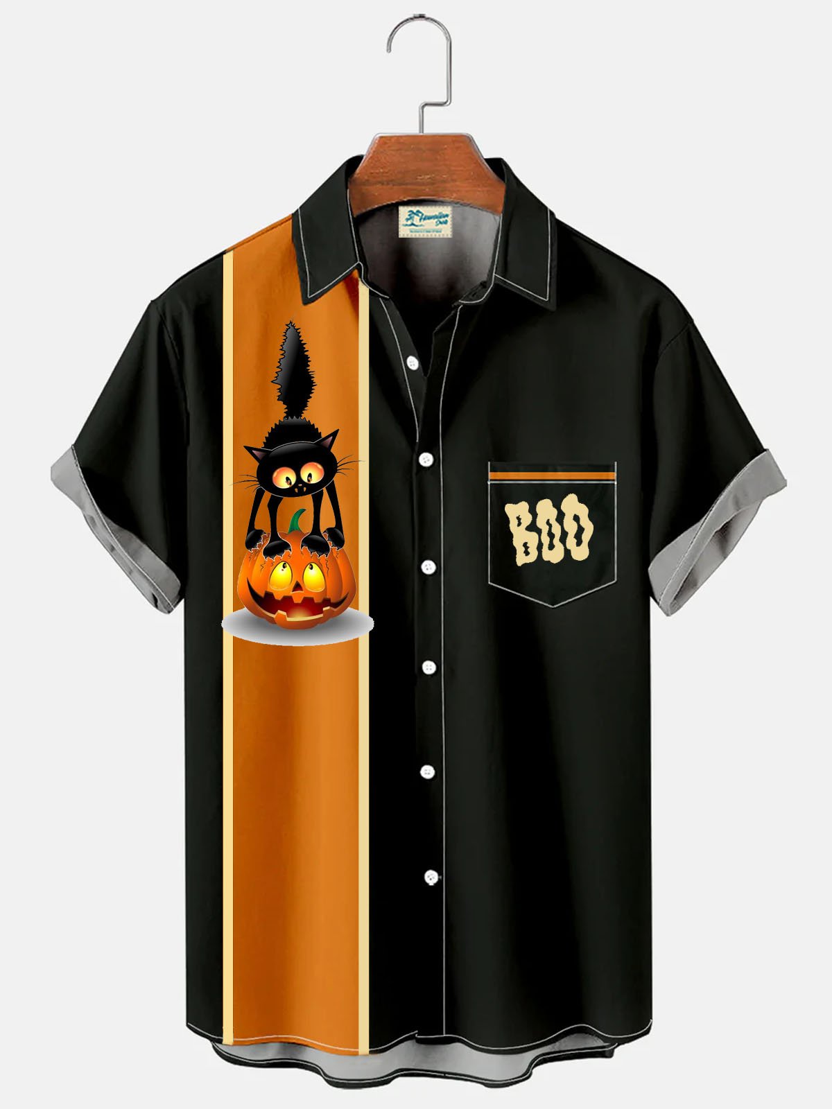 Halloween Black Cat Pumpkin Print Short Sleeve Bowling Shirt