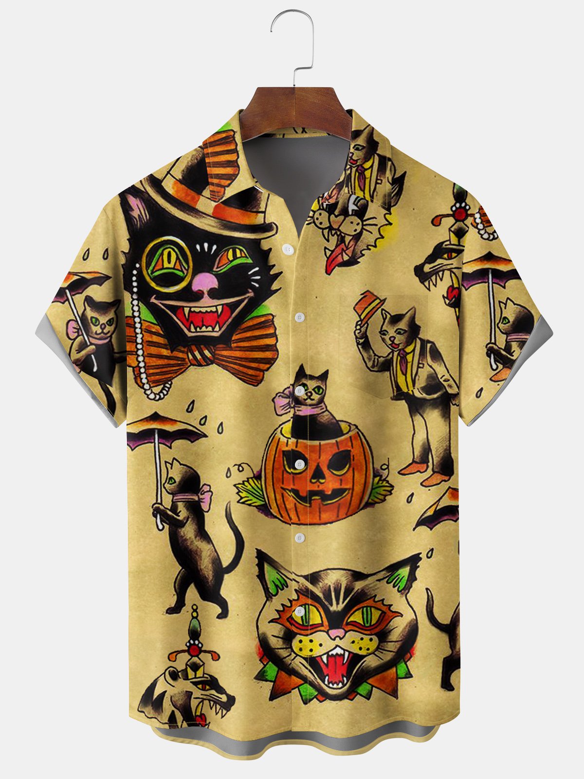 Halloween Fun Cat Print Casual Breathable Hawaiian Short Sleeve Shirt