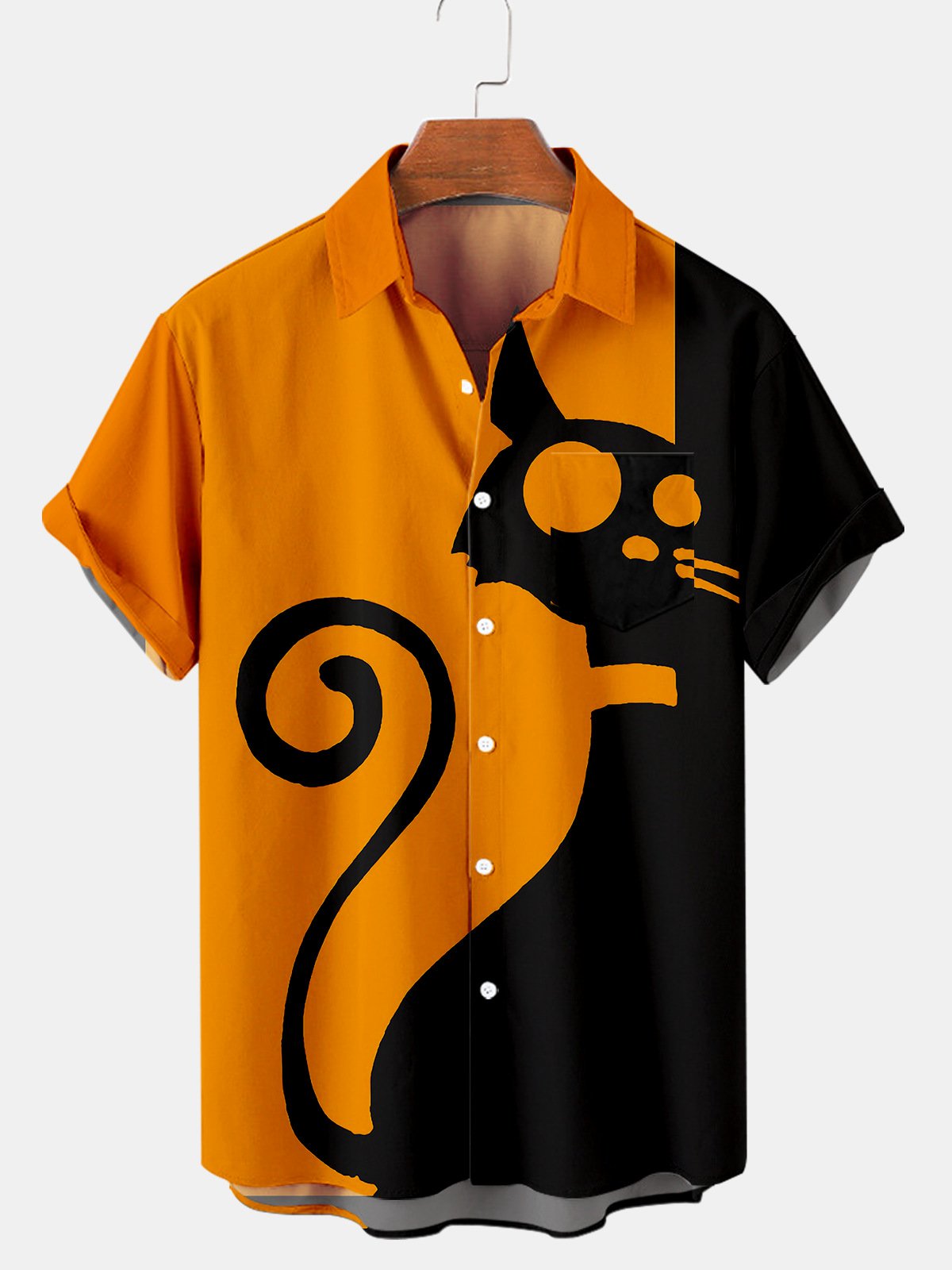 Halloween Mens Funny Cats Shirt Collar Pockets Tops