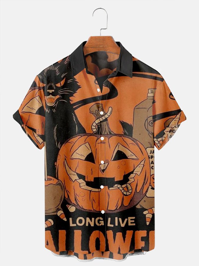Halloween Pumpkin And Cat Print Short Sleeve Shirt