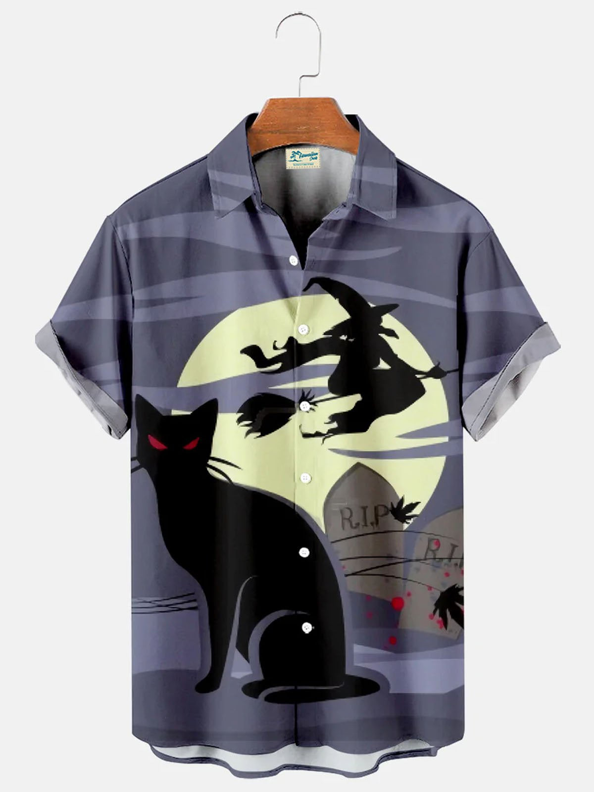 Men's Halloween Black Cat Witch Print Short Sleeve Shirt