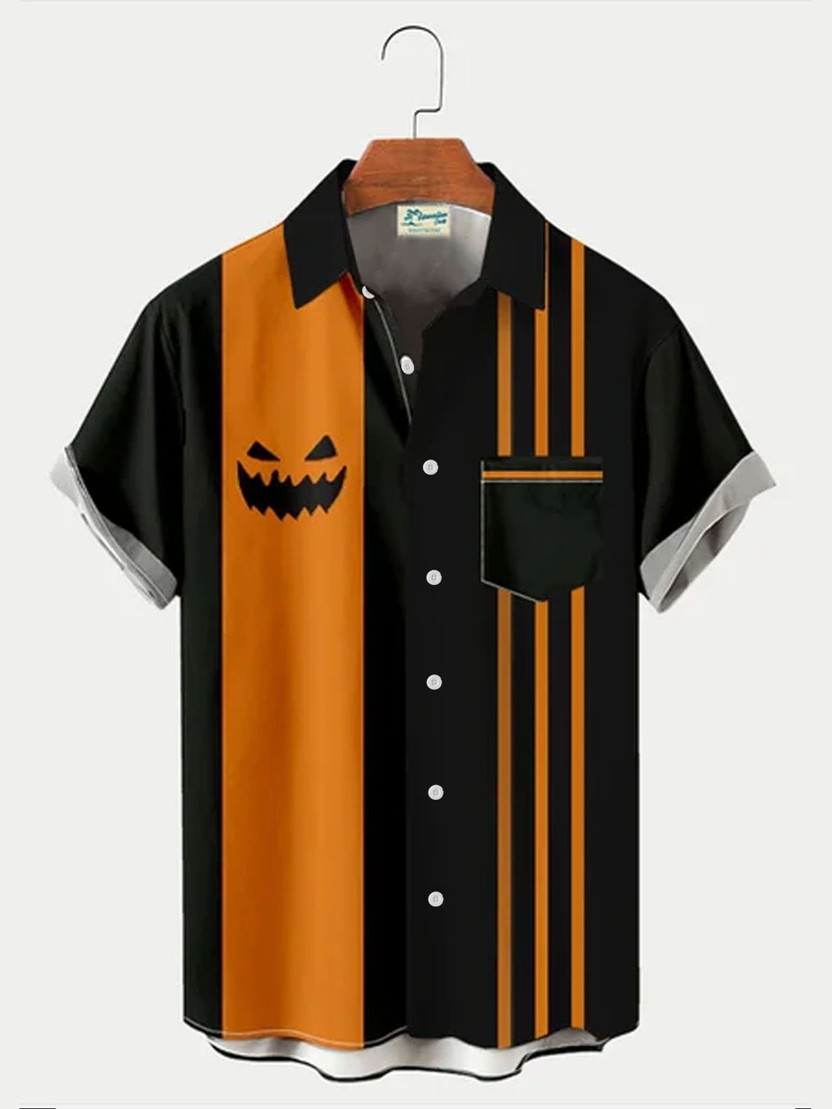 Men's Halloween Pumpkin Stripe Contrast Print Short Sleeve Bowling Shirt