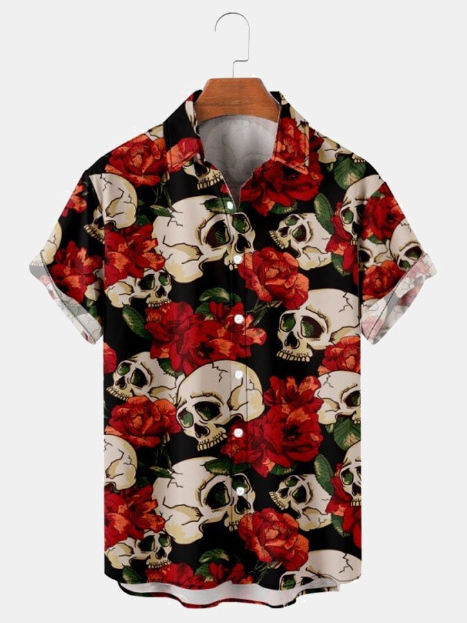 Men's Creative Halloween Rose Skull Print Short Sleeve Shirt