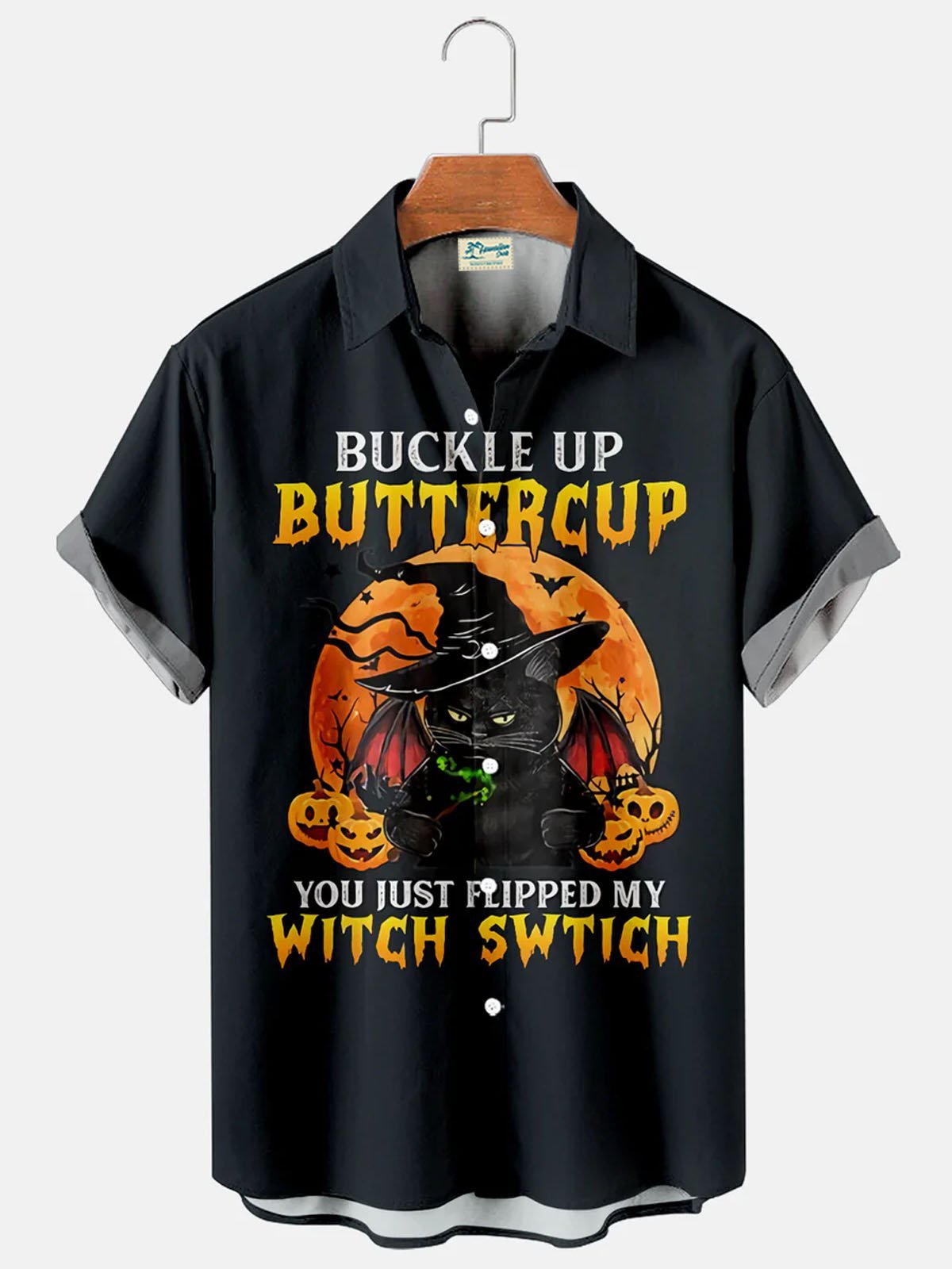 Men's Halloween Black Cat Pumpkin Print Short Sleeve Hawaiian Shirt